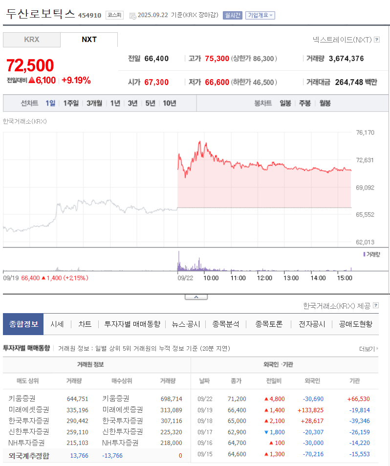 9월 22일 두산로보틱스는 강력한 상승세를 보였습니다.