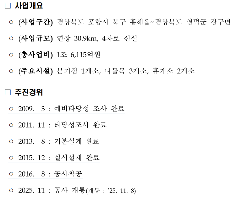 2025년 11월 8일 오전 10시, **포항~영덕 고속도로(30.9km 구간)**가 드디어 개통되었습니다.