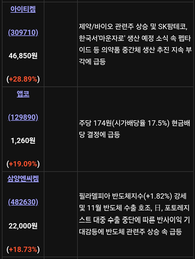 - 앱코(129890): 주당 174원(시가배당율 17.5%) 현금배당 결정에 19.09% 급등.