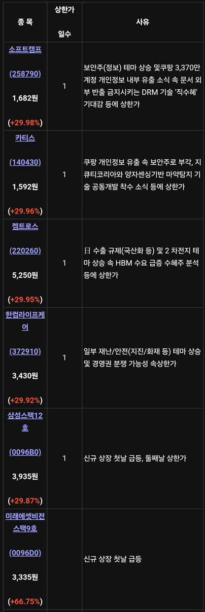 - **소프트캠프(258790)**와 **카티스(140430)**는 쿠팡 개인정보 유출 소식에 따른