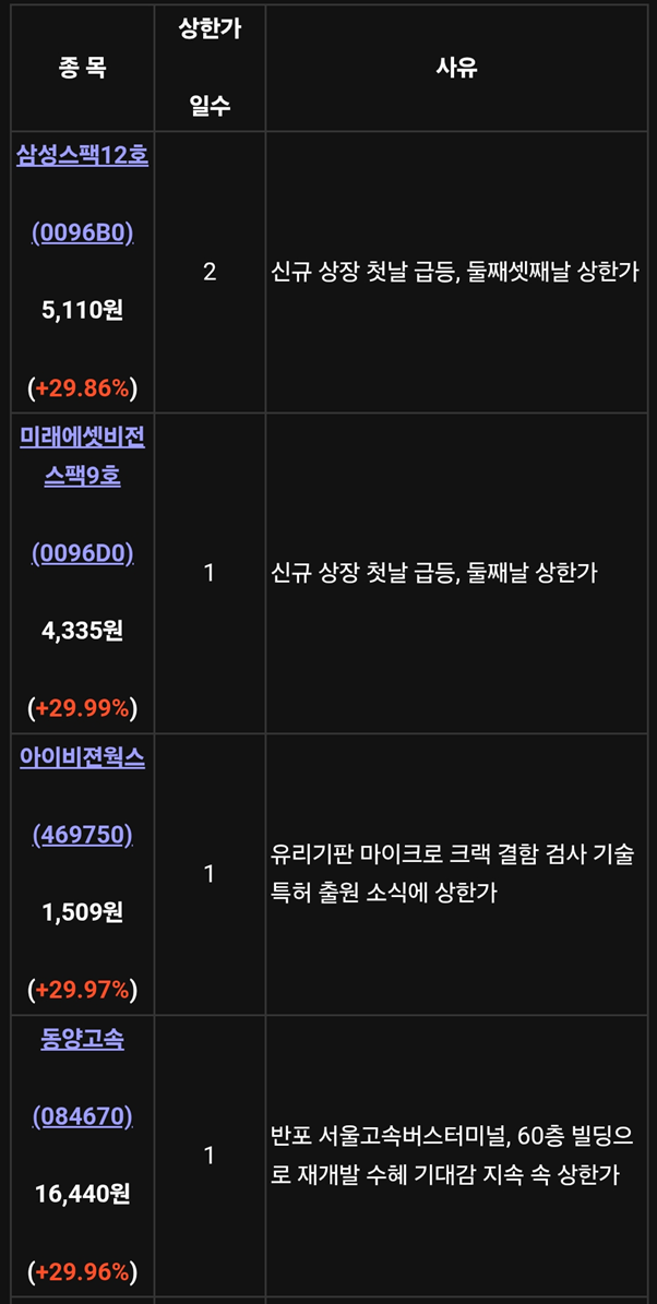 | 미래에셋비전스팩9호 (0096D0) | 4,335원 (+29.99%) | 1일 | 신규 상장 후 급등 모멘텀 지속 |